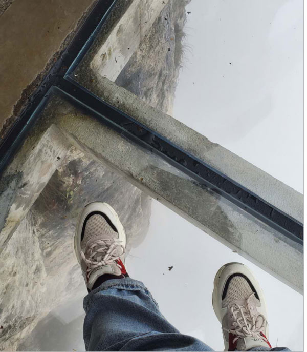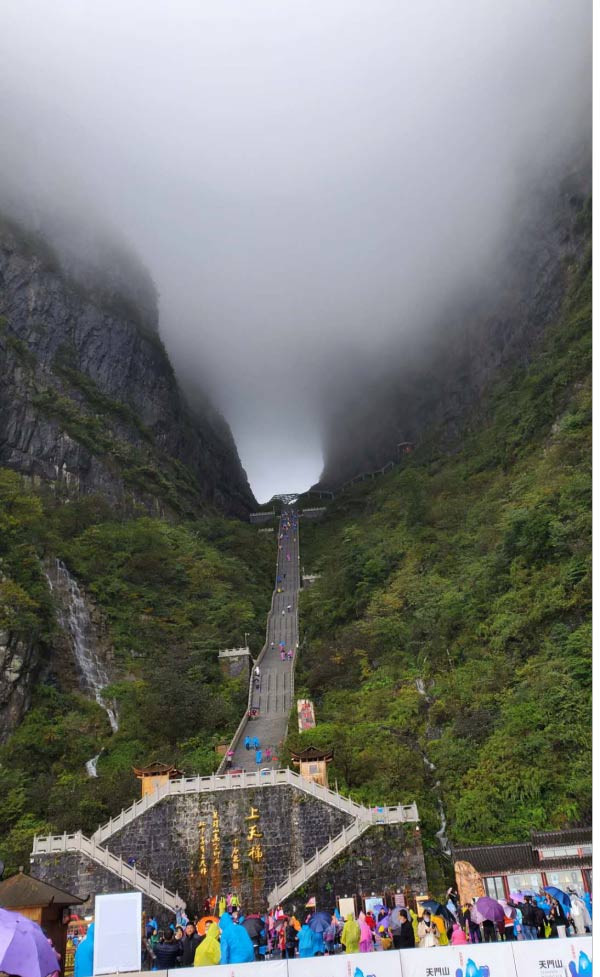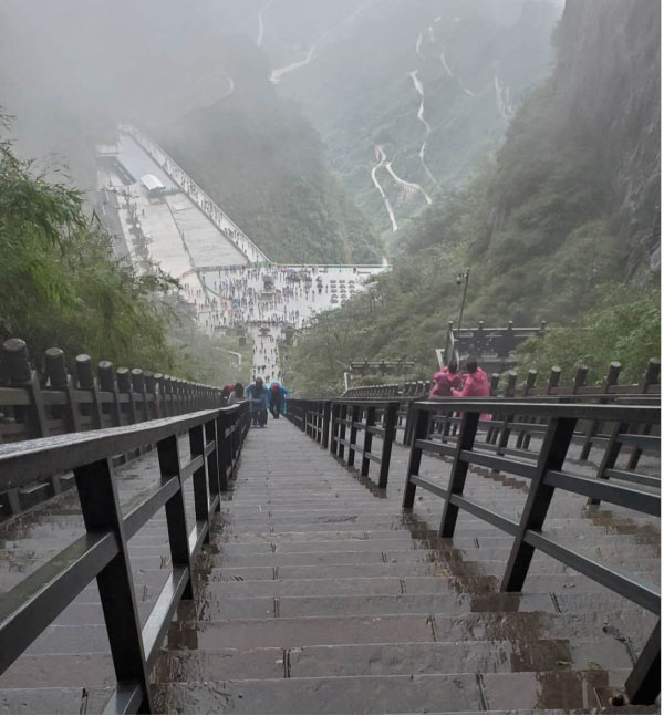 于是在我們又轉(zhuǎn)了7層電梯后,終于來(lái)到了天門洞上。依然是白茫茫的一片,天門山棧道,底下原本高聳陡峭的山崖,在白霧的襯托下,一點(diǎn)兒也不讓人覺(jué)得害怕了,只是雨天濕滑,內(nèi)心在默默祈禱千萬(wàn)不要摔倒就好。