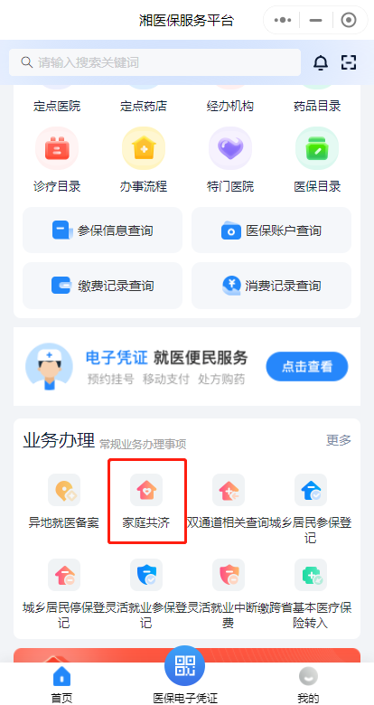第一步:下載“湘醫(yī)保”App,或進(jìn)入“湘醫(yī)保”App小程序,登錄后在首頁“業(yè)務(wù)辦理”中找到“家庭共濟(jì)”,點(diǎn)擊“共濟(jì)申請”。